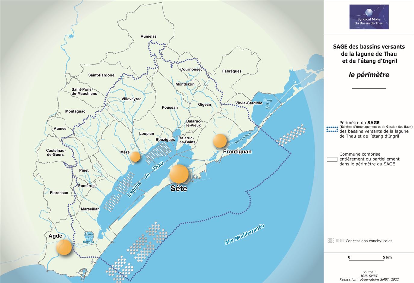 Cours d’eau, eaux souterraines, lagunes, zones humides, canaux et eaux côtières, le périmètre du SAGE, défini par arrêté préfectoral en 2006, englobe l’ensemble des ressources en eau et des milieux aquatiques à l’échelle du bassin versant de la lagune de Thau et de l’étang d’Ingril.